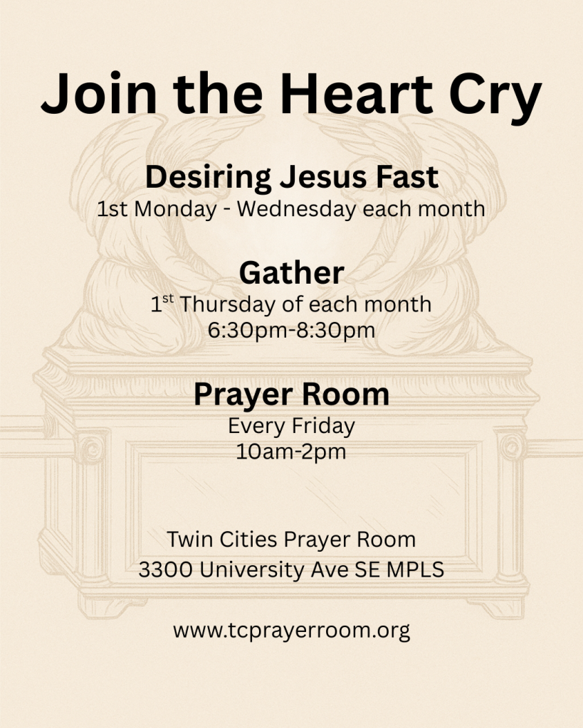 Located in the geographic center of the Twin Cities metro, and at the highest elevation of Minneapolis, the Twin Cities Prayer Room has been established to worship and pray to the worthy Lamb. Unified as a city, we desire to partner with the Holy Spirit in establishing a resting place on earth for God. We long to see His Kingdom come and His will be done on earth as it is in heaven. Come join us as we cry out for repentance and revival in the Church!